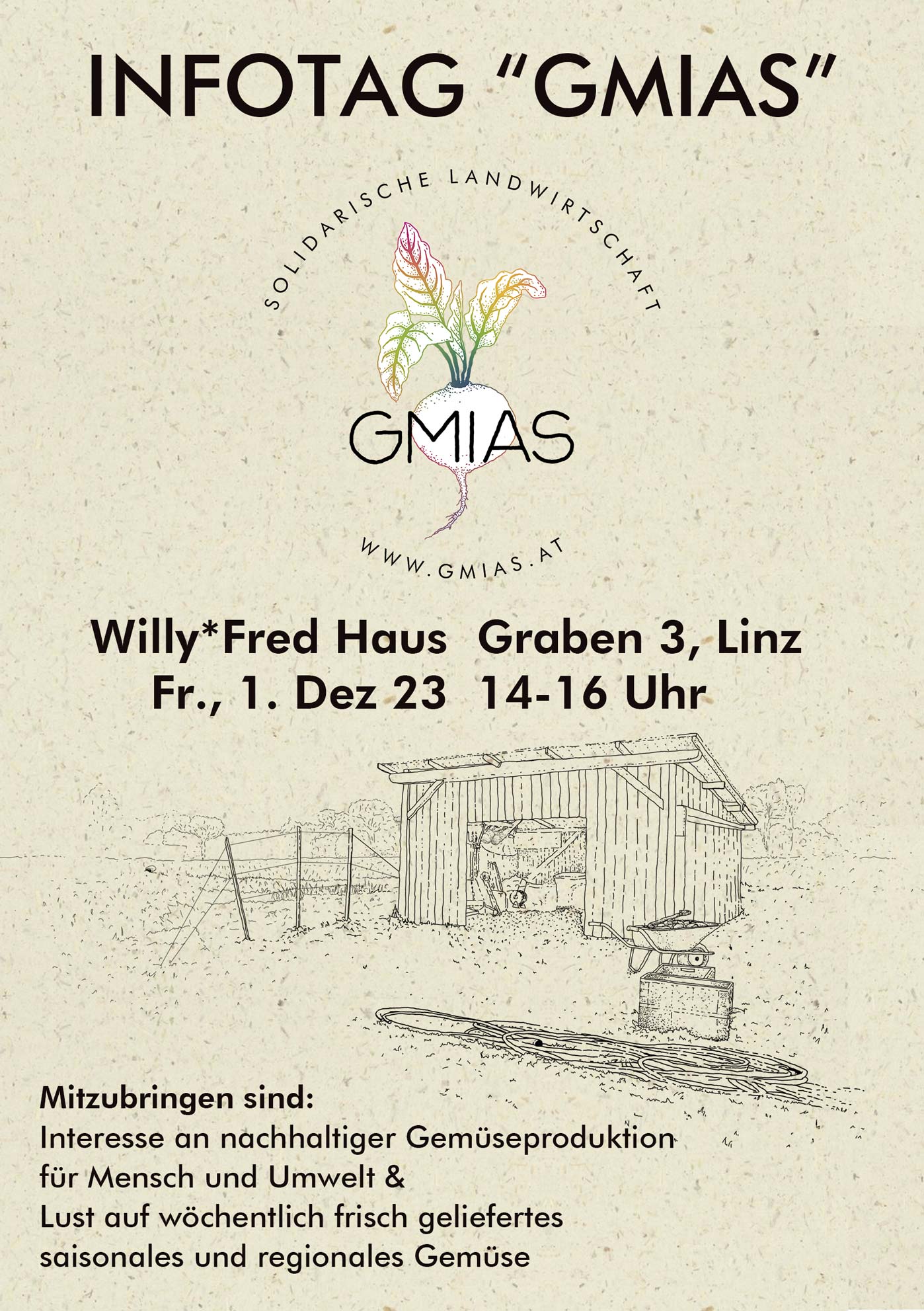 INFOTAG am 1.12.2023 um 14 Uhr im Willy*Fred Haus (Linz) Am Freitag, den 1.Dez 2023 von 14 – 16 Uhr laden wir Interessierte ein, die SOLAWI „GMIAS“ näher kennen zu lernen.